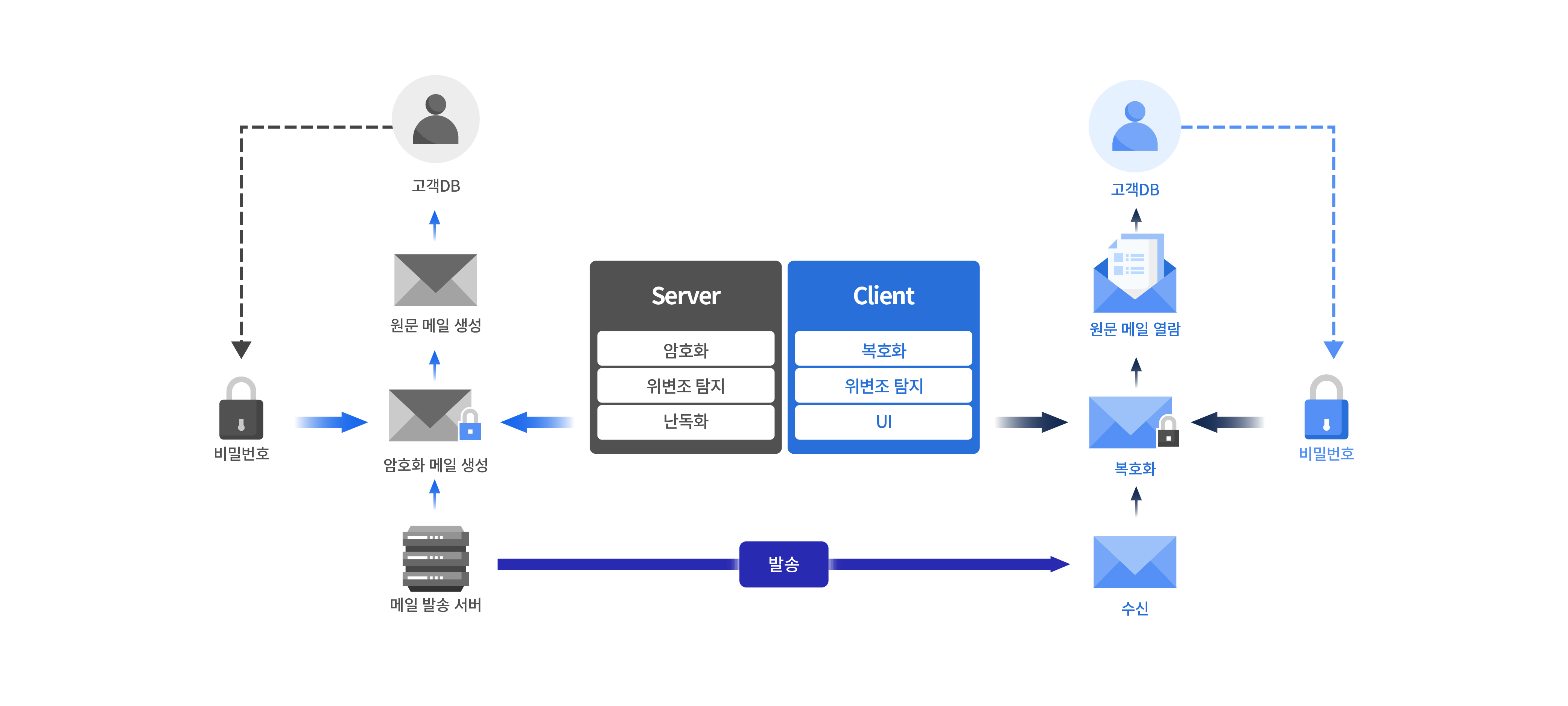 이메일 본문(텍스트)과 첨부파일을 암호화하고, PDF·ZIP·MS OFFICE 파일의 암호화를 위한 표준 인터페이스를 제공하며, EED·AES·ARIA·SHA256 등 다양한 암호화 알고리즘을 지원합니다.