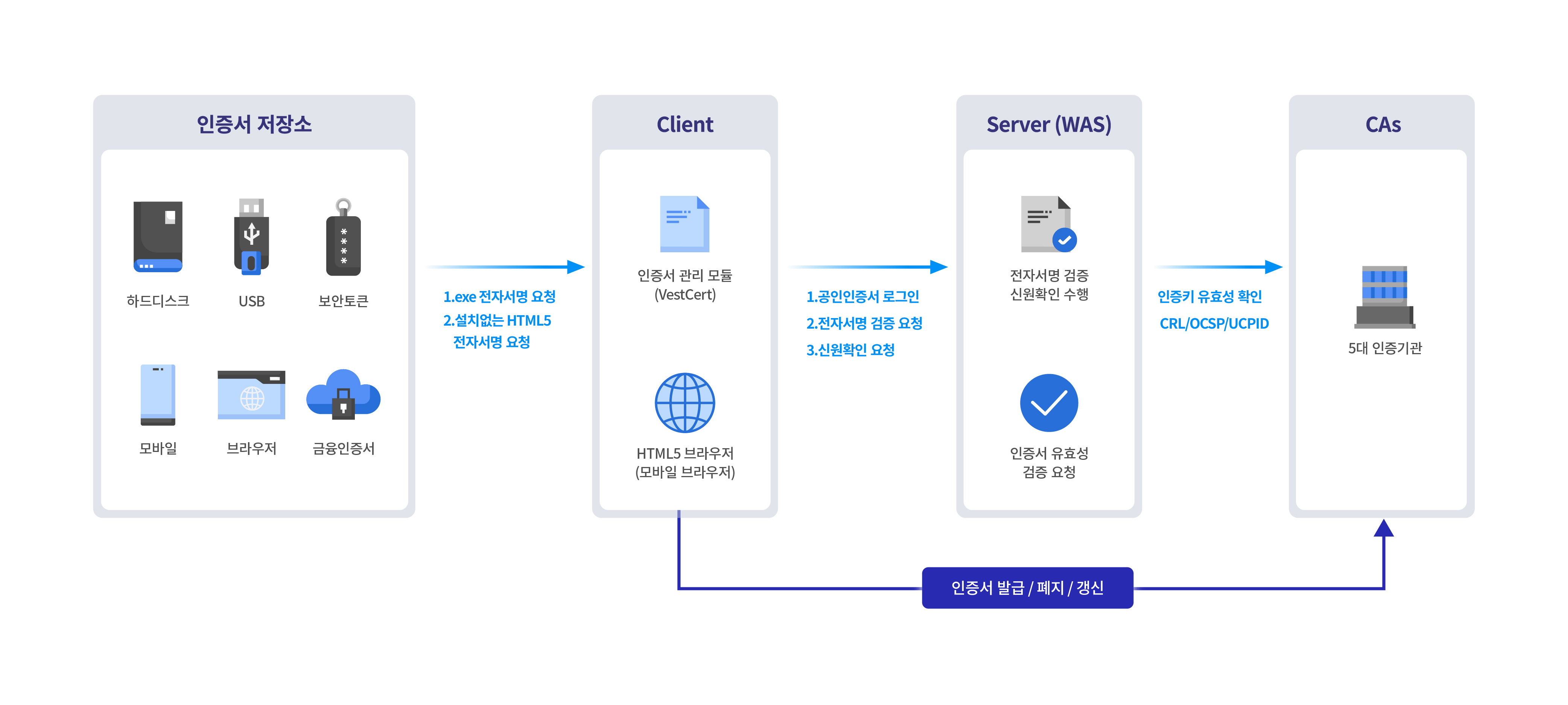 하드디스크, H/W 보안토큰, 인증서 파일(PFX, P12), USB 및 모바일 인증서 저장소를 지원하여 사용자가 원하는 저장매체를 자유롭게 선택할 수 있습니다.